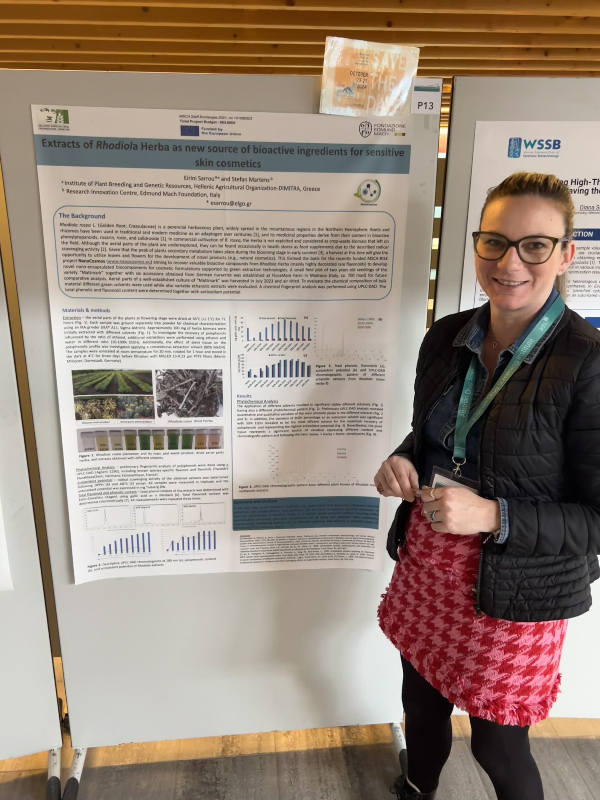 P37, prepared by Martens S. and Sarrou E., explored the potential of Rhodiola rosea as an exciting new source of bioactive extracts for sensitive skin cosmetics. Rhodiola herba, also known as Arctic root or golden root, is a plant known for its adaptogenic properties. The recently funded MSCA-RISE project NanoCosmos aims to recover valuable bioactive compounds from Rhodiola herba (mainly highly decorated flavonoids) to develop novel nano-encapsulated biocomponents for cosmetic formulations supported by green extraction technologies. These bioactive extracts from Rhodiola herba hold significant promise for the formulation of cosmetics catering to the needs of sensitive skin, ushering in a new era of skincare innovation.